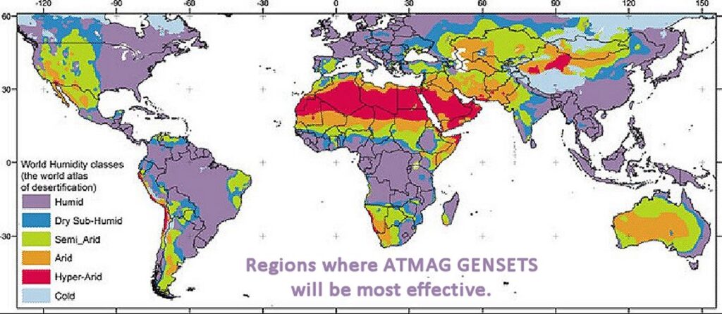 For example, residential ATMAG GENSET 250L (Atmospheric Magnetic generator producing up to 250 liters of water per day) or industrial ATMAG GENSET 4K L (Atmospheric Magnetic generator producing up to 4,000 liters of water per day). For example, in a desert near the ocean, the atmospheric conditions can be 28°C (83°F) at %RH86 – 86 Gallons Per Hour (GPH). 2,064 Gallons Per Day = 7,813 Liters/Day
