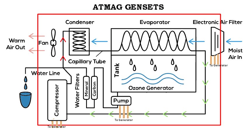 That is exactly why our ATMAG GENSETS Atmospheric Water and Magnetic Electric Generators are ideal for use inside homes and office buildings. This puts a new meaning to the line “water cooler chat, or water cooler talk, or water cooler conversation”. It not only extracts moisture from the indoor air but also complements this eco-friendly and energy-efficient process by providing clean and safe drinking water (H2O).